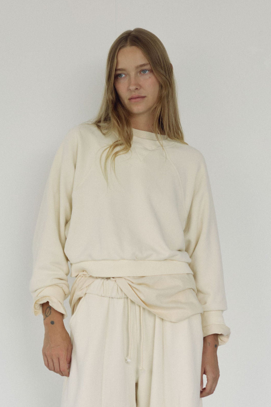 An oversized raglan that's slightly cropped featuring a v stitching detail at the neckline.