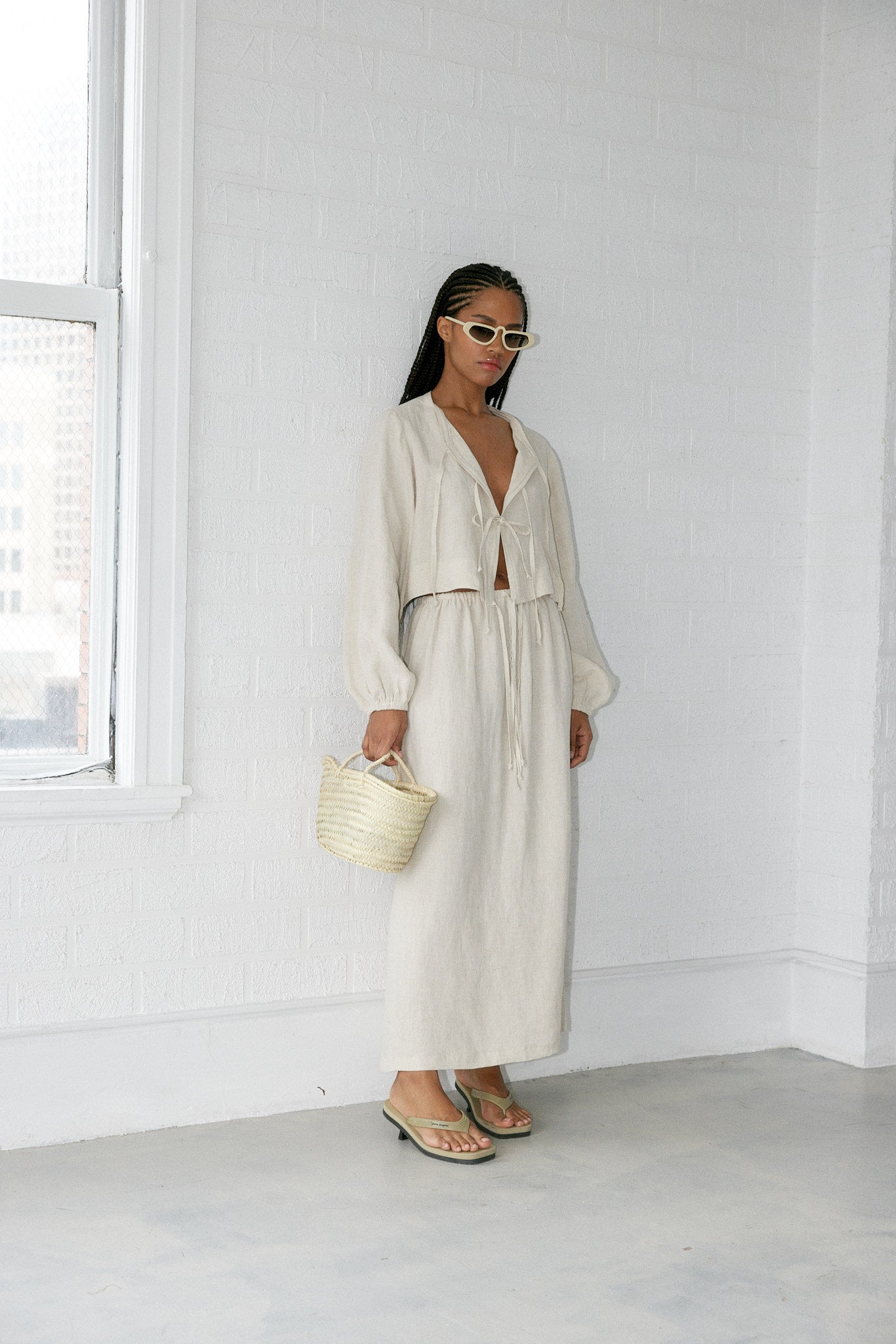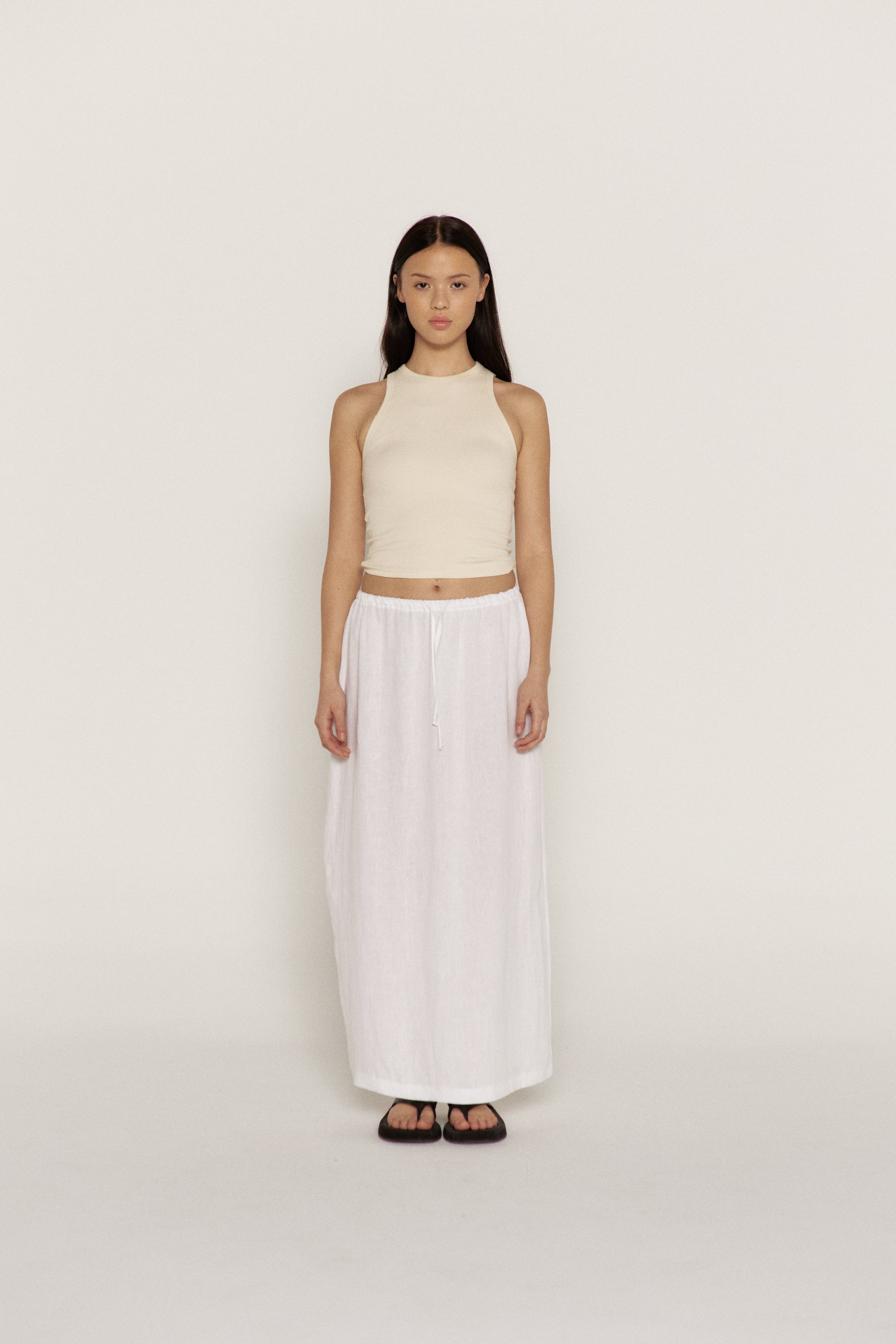 Our skirt goes with everything and is a nod to 90's simplicity with an elasticated waist and drawstring closure. Slit at back of skirt for easy movement. Roll the waist band for a shorter length.