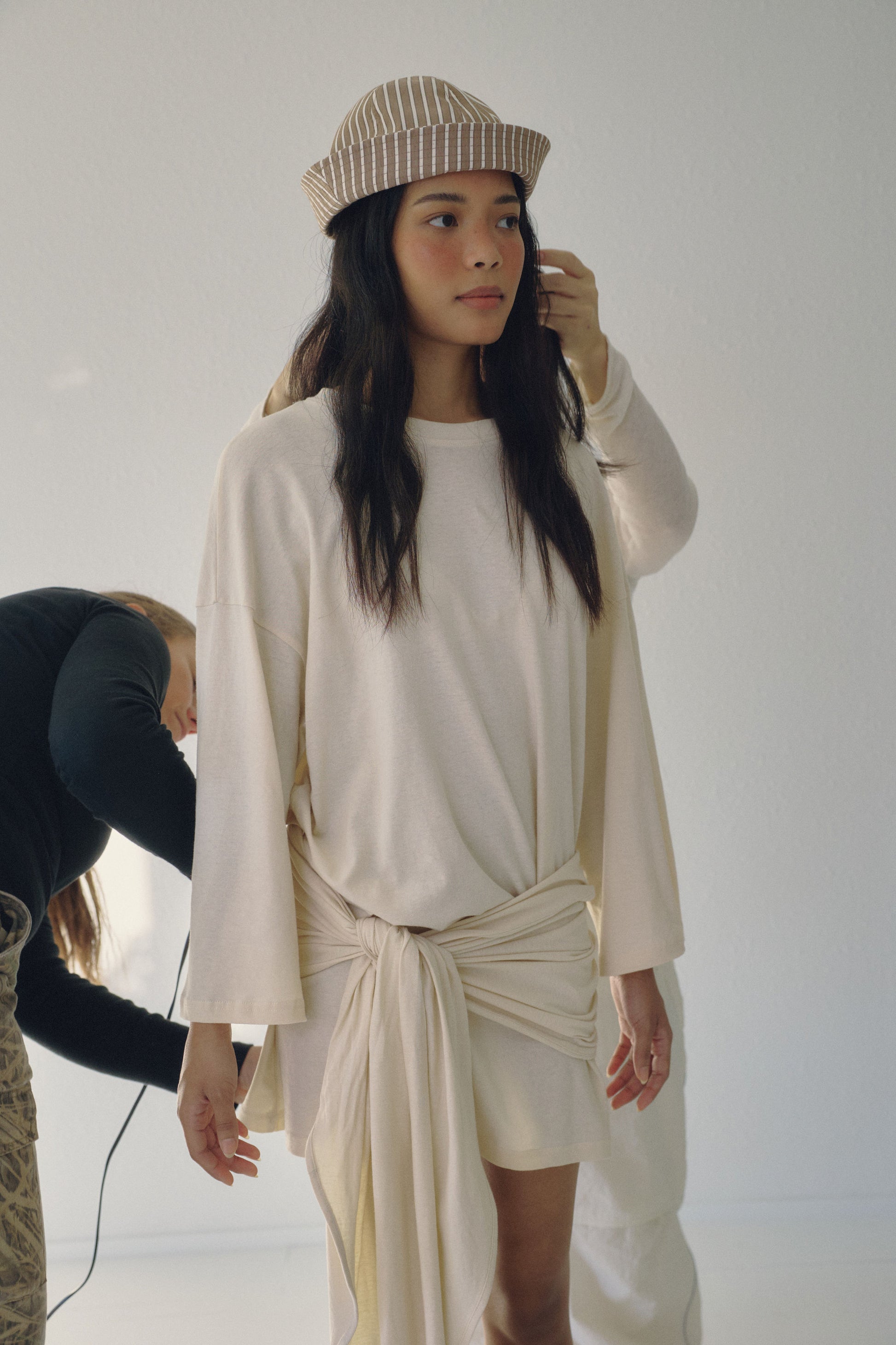 Our take on a vintage sailor hat with the option to fold the brim down and a bungeee cord to adjust the fit.