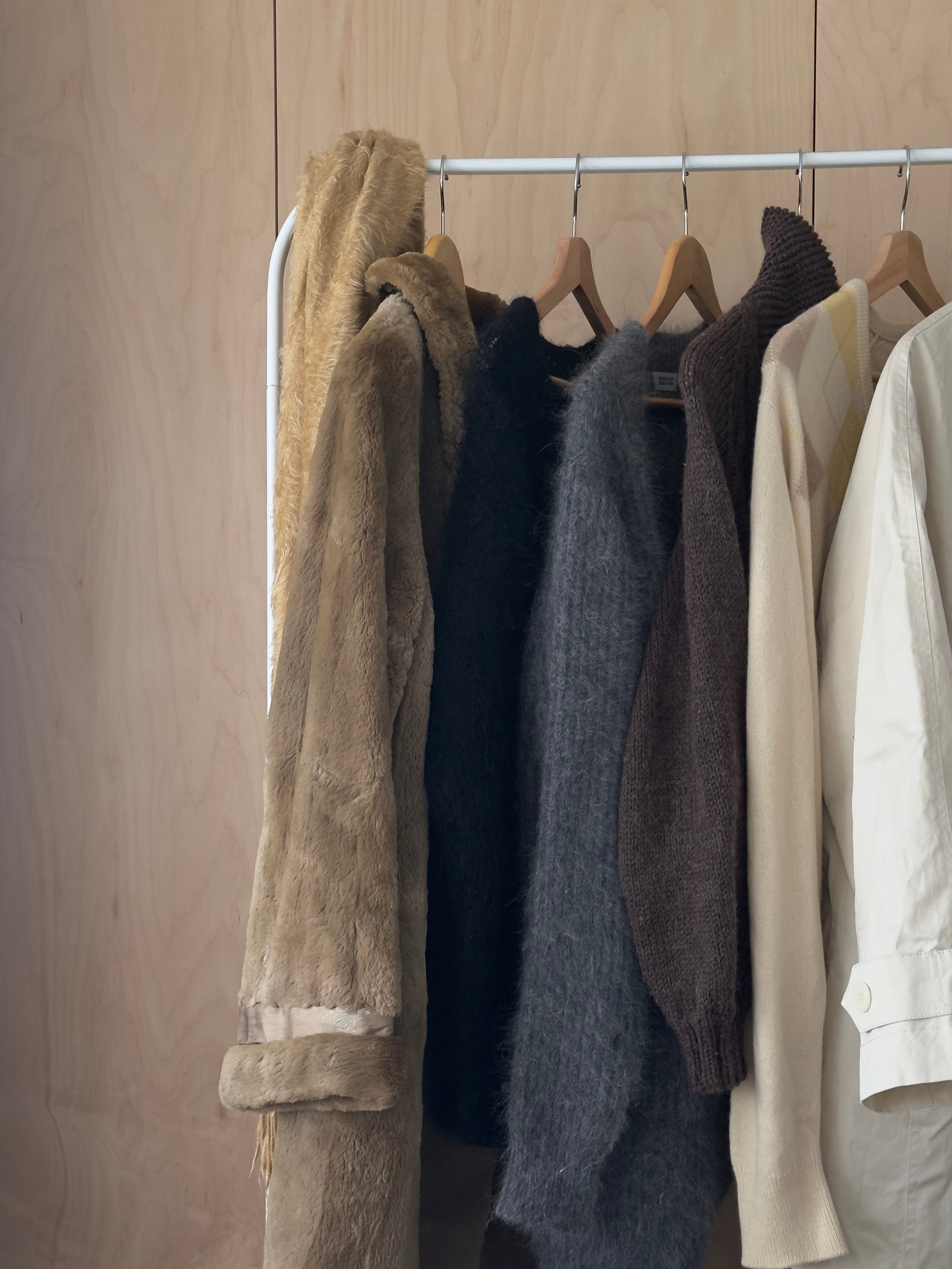 vintage fur coat size s, fuzzy scarf, 4 vintage knits, preloved trench s/m, play cardigan size s (wool, but possibly a dupe) , preloved tote