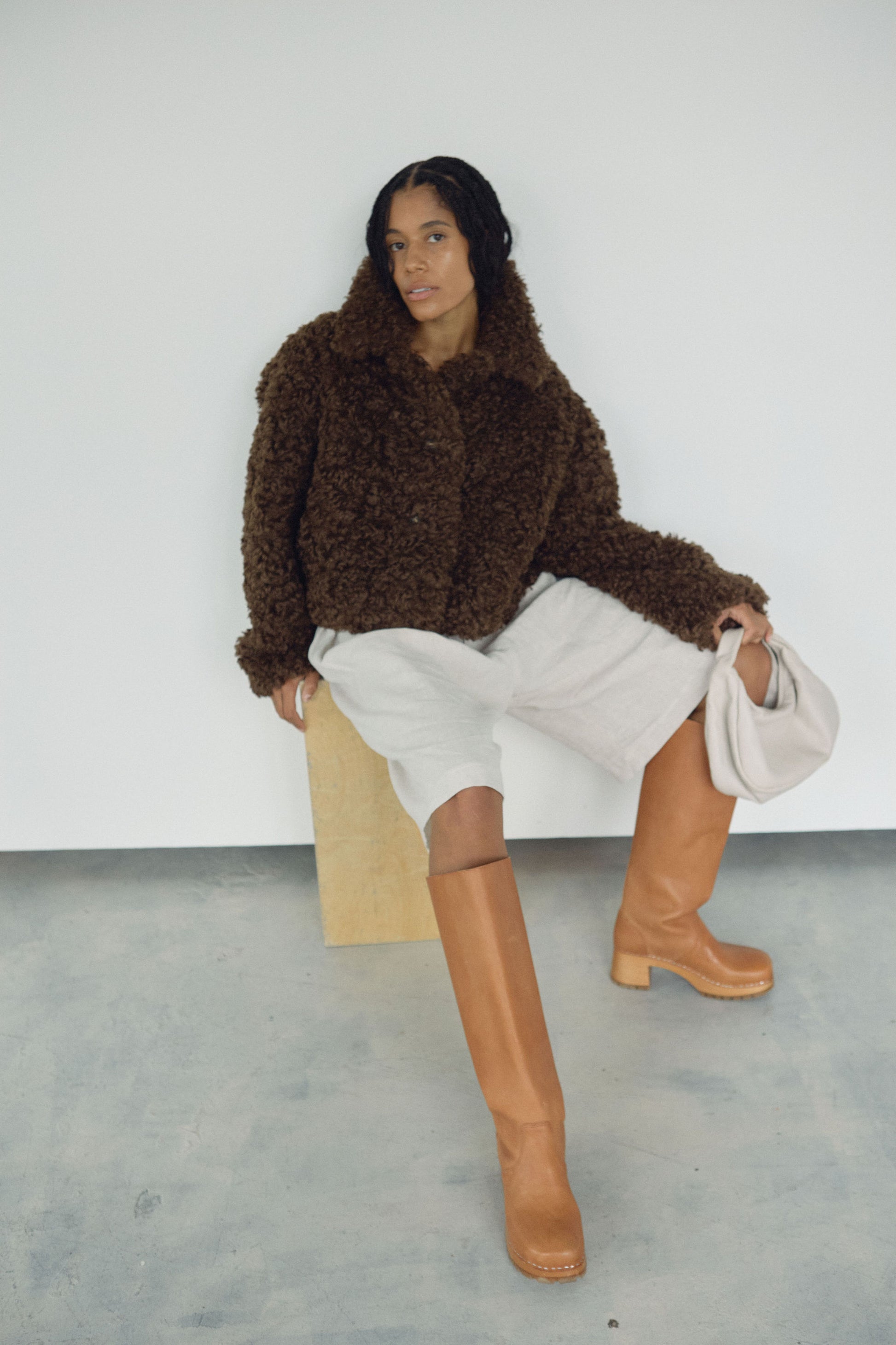 A faux fur coat in a dark brown shade with a button up closure and matte satin lining.