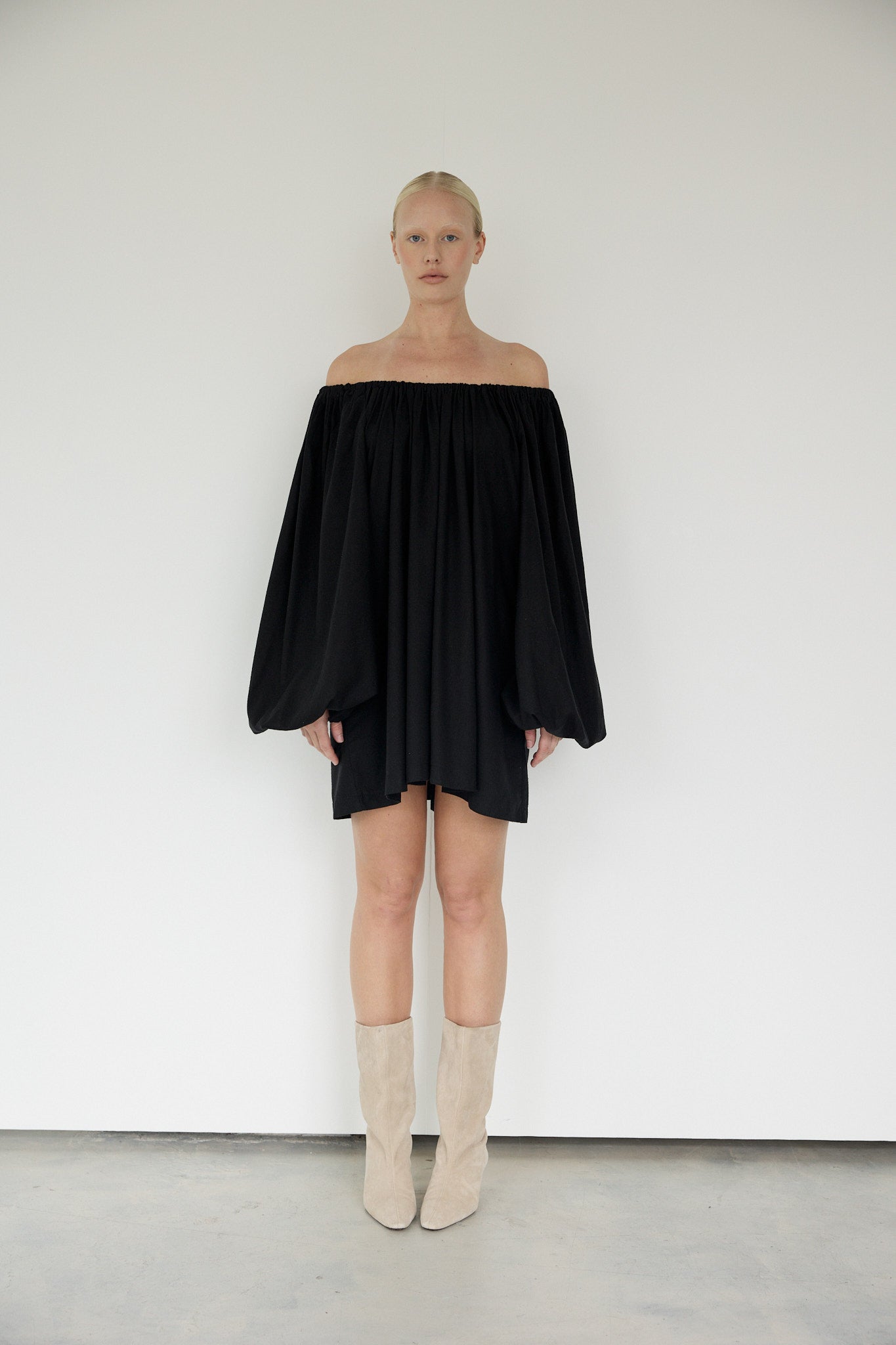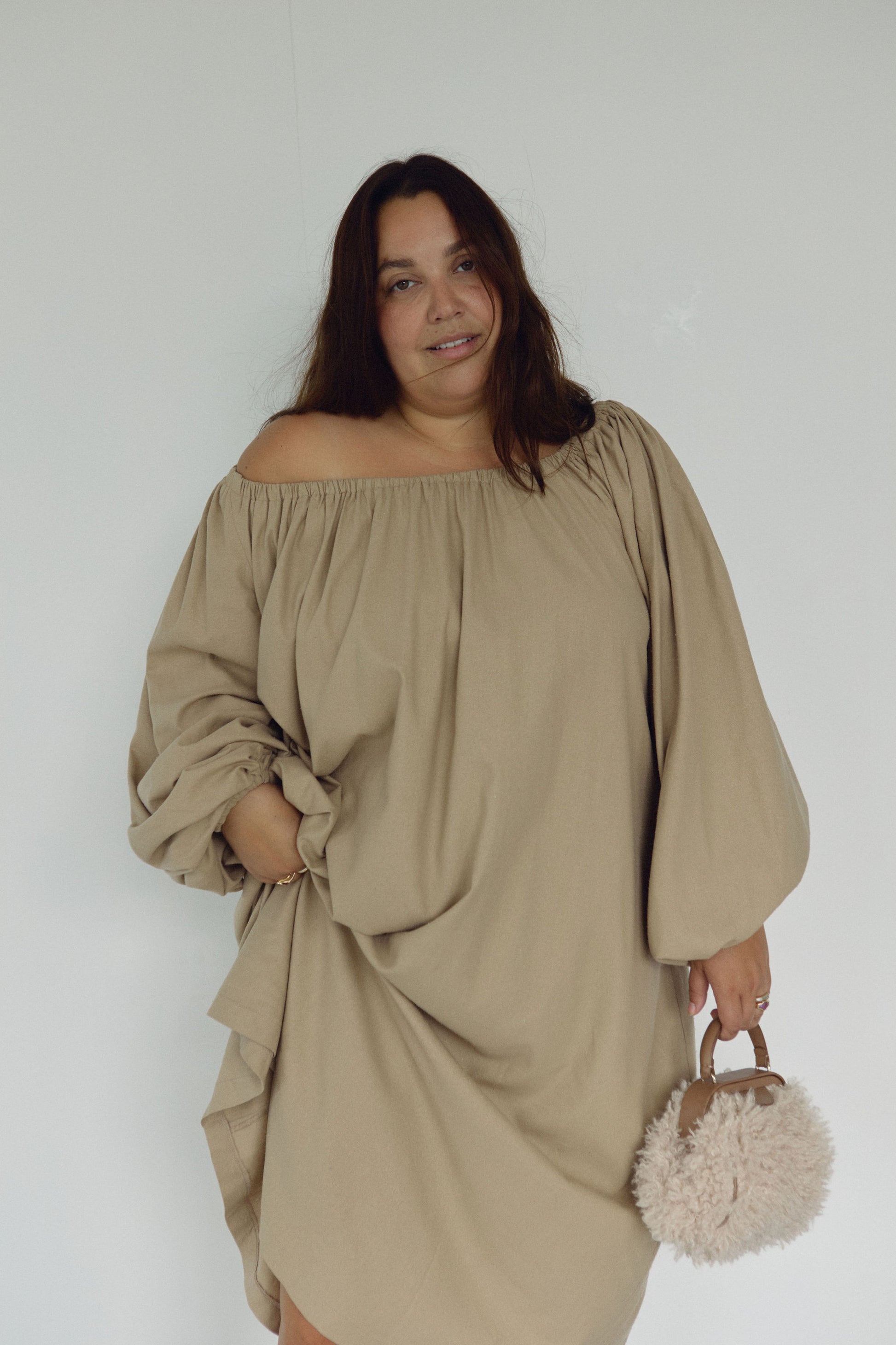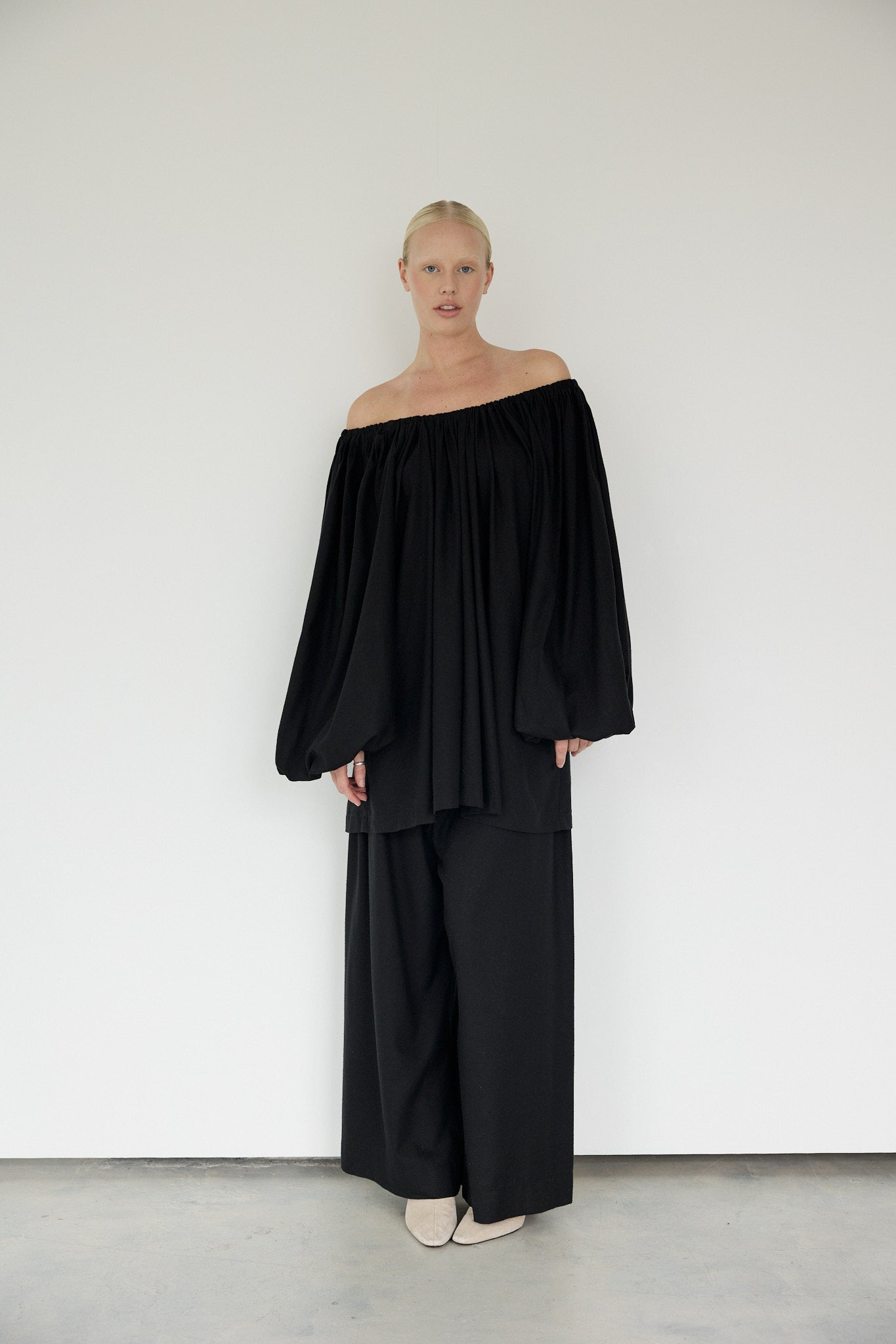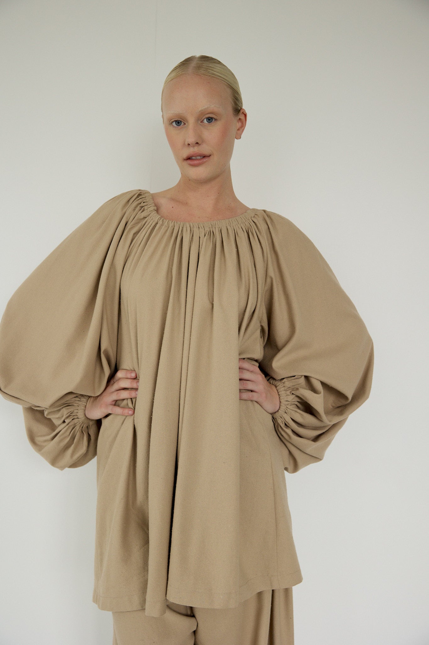 This style features a billowy sleeve with an elastic wrist and an elastic neckline. If you would like your sleeves more 'practical' or without an elastic and shorter, feel free to email post purchase and we can accommodate this.