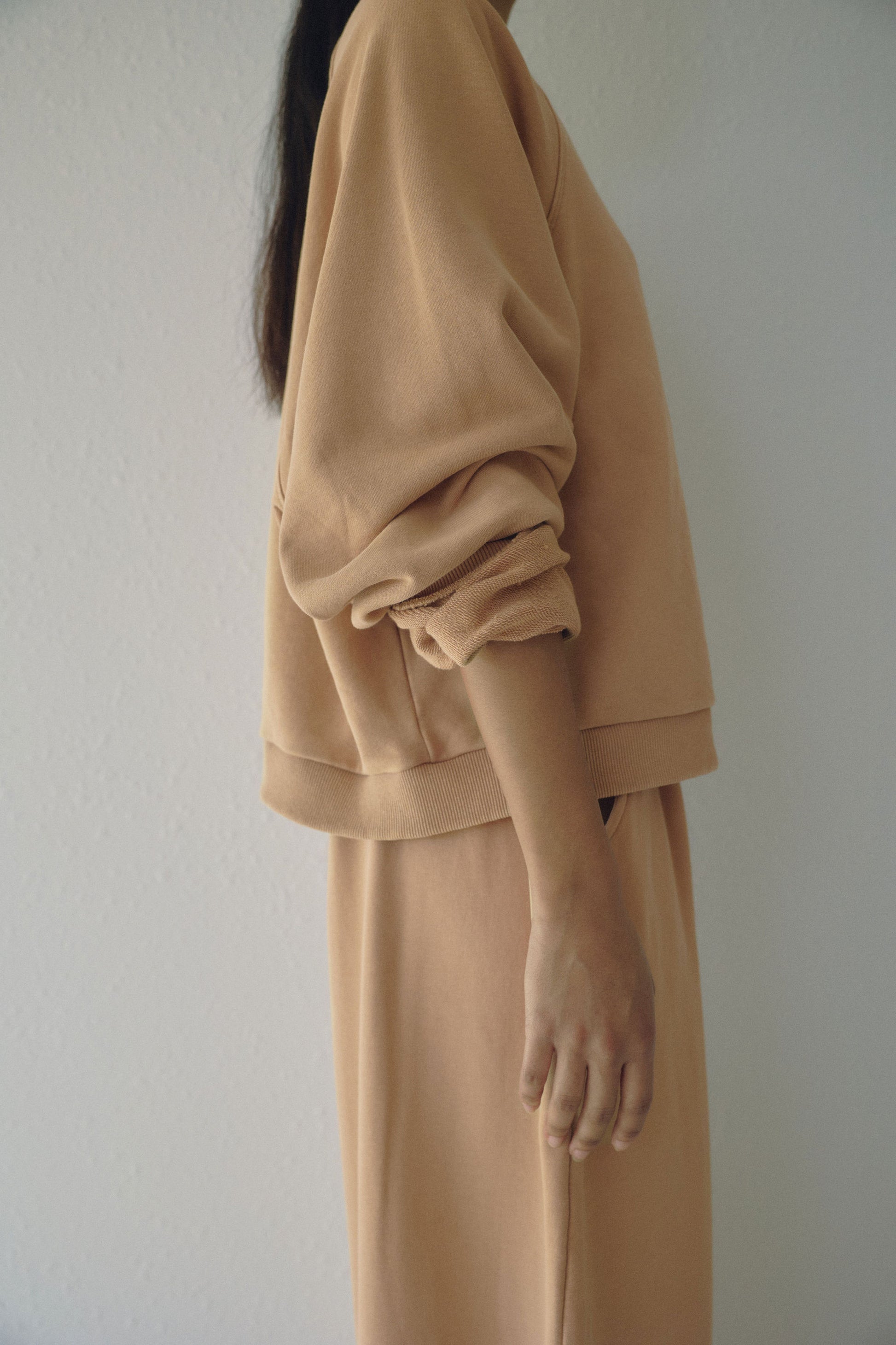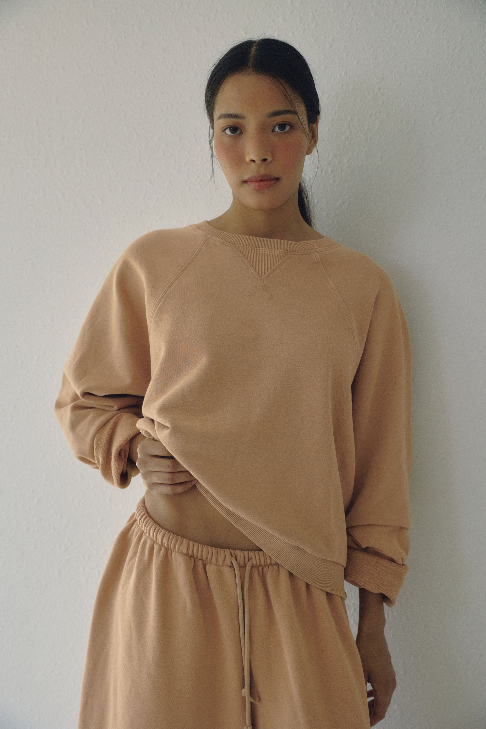 An oversized raglan that's slightly cropped featuring a v stitching detail at the neckline.